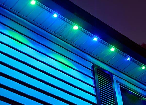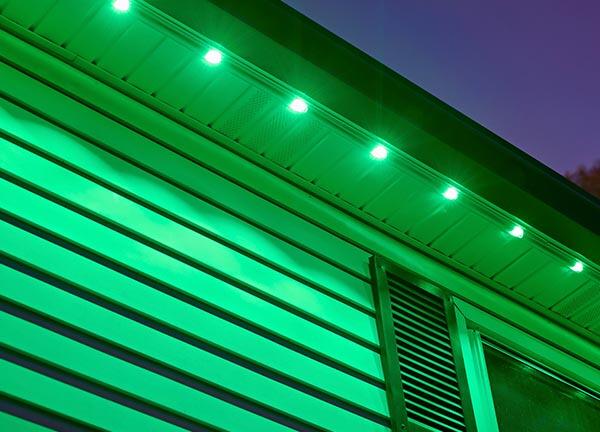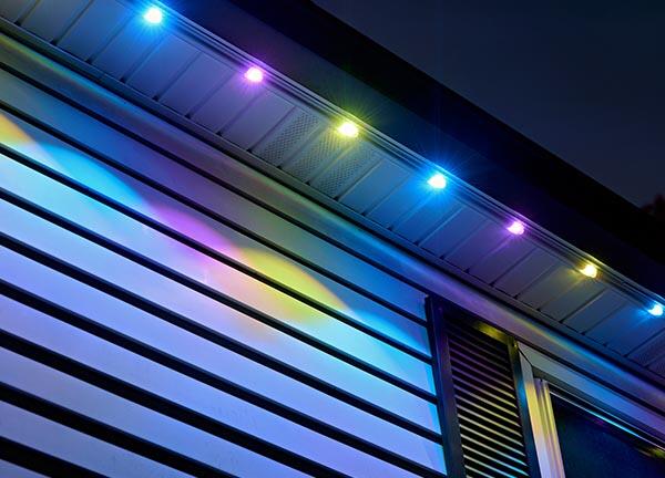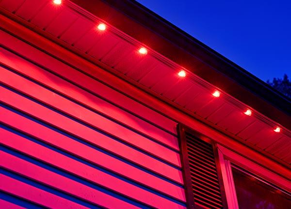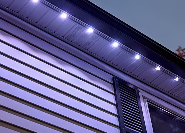 Discreet under-soffit lights stay hidden by day and deliver brilliant, customizable illumination at night.